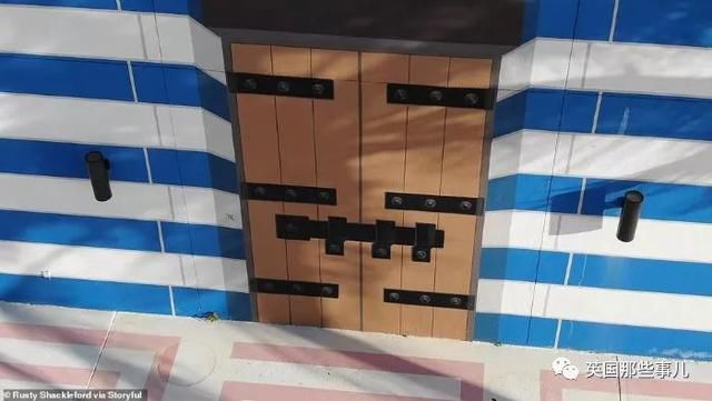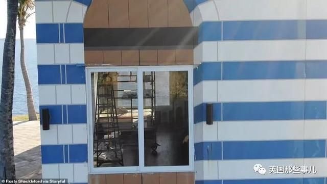 外墙被刷上蓝白相间的条纹,兴办四周的白色大地上还有赤色的几许图案。