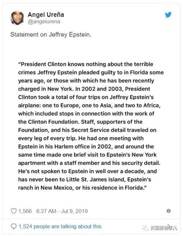 克林顿表现闭于Epstein几年前和迩来的恐怖罪过都一无所知,而且二人已经十多年不和Epstein说过话了,克林顿自己也从没去过小圣詹姆斯岛,以及Epstein在新墨西哥州的牧场和佛罗里达州的住宅。
