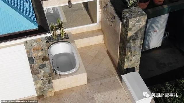 在一座好像客房的兴办一角,树立了白色的露天浴缸,浴缸背地的墙上还装了伟大的镜面,占满整面墙壁,