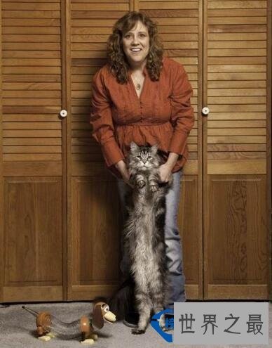 它是生活在美国的缅因猫(Stewie),身长有1.23米,是目前世界上已知最大只的猫咪。同时它的尾巴也是最长的,为41.5厘米。所以这也是世界上最长的猫。