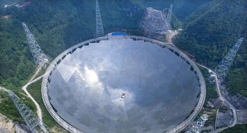 直径500米的球面射电望远镜FAST应用贵州贵州喀斯特意域的洼坑动作望远镜台址。是世界上口径最大、最具能力的单天线射电望远镜。造价 12 亿元群众币,直径达500米,有30个脚球场大,主曲射面的面积达25万平方米,与号称“大地最大的呆板”的德国波恩望远镜比拟,敏捷度普及约10倍。