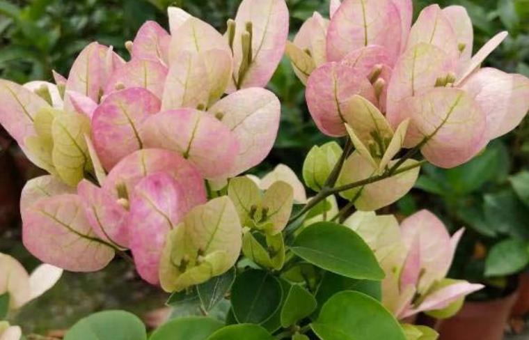 相比于其他的三角梅品种,绿叶五宝的叶片比较小,花朵的形状是心形的,上面有粉色的斑点,在阳光的照耀下,斑点会逐渐加深,颜色越来越漂亮。