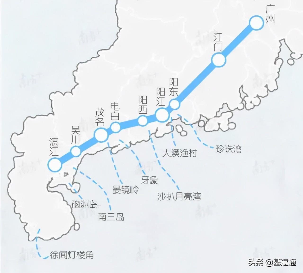 这一段走合浦至湛江高速铁路,正线线路全长137.82公里,联络线长度25.97公里(北海联络线),速度目标值为350公里/小时。项目业主为广西沿海铁路股份有限公司,项目由中国铁路南宁局集团有限公司代建。建成后从北海到湛江只需30分钟,到广州仅2.5小时。