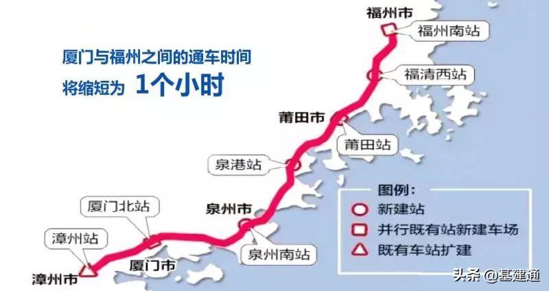 全长277.42公里,总投资约499亿。是我国首条跨海高铁。福厦高铁自福州市引出向南经莆田市、泉州市、厦门市终至漳州市,全线共设客站7座,设计时速350公里。拟于2025年6月与新建厦门北站同步建成投用。开通后两地通行时间将缩短至1小时内。