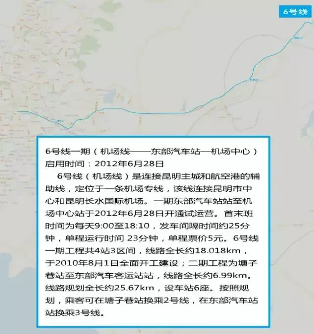 昆明轨道交通6号线是昆明轨道交通的第六条线路,采用地铁标准B型车。一期工程已于2012年6月28日开通,是昆明市第一条运营的地铁线路。二期工程已于2014年7月1日开工。该线路是连接主城区与昆明新机场之间的地铁线路,全长26.6千米。