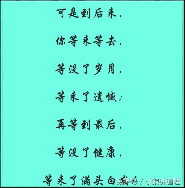 小狼想说:时光易逝,也许是你的懒惰导致了等待,也许是你的安于现状导致了你的等待。不管因为什么,请告诉自己,时不我待,人生最经不起的就是“等待”!好好把握现在!!!