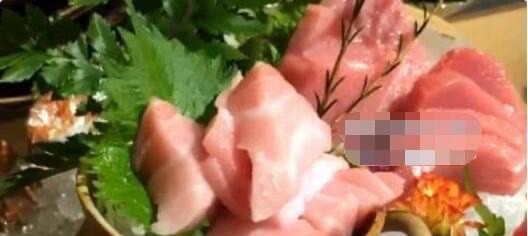 赤身就是鱼的背部,蓝鳍金枪鱼赤身的颜色是红色偏粉色的,这是因为含有丰富的油脂,让它与其他被算作白肉的鱼类区分开,赤身的口味相对紧实,适合做寿司一类的菜肴。