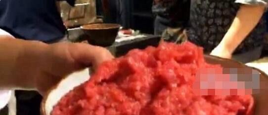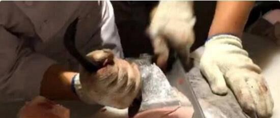 粉红的蓝鳍金枪鱼肉在接触空气后会迅速发生氧化反应,颜色逐渐变暗。所以解剖完毕,鱼肉要迅速处理成刺生。