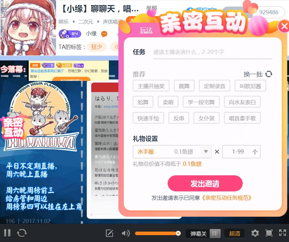 水友可以通过送礼物来指定主播进行一些互动表演,比较正常就是唱歌,跳舞,或者抽奖之类的了,像人均变态的 196 就还有一些女仆装贺表白这样的套路。当然谁有也可以自己定义互动的内容,比如带上猫耳朵之类的。