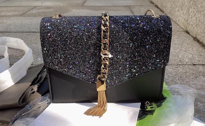 闪亮的铆钉包。这款包包最特别的就是在晚上的时候,下边的亮片在有灯光的情况下闪闪的,十分惹眼!