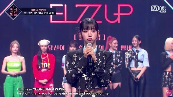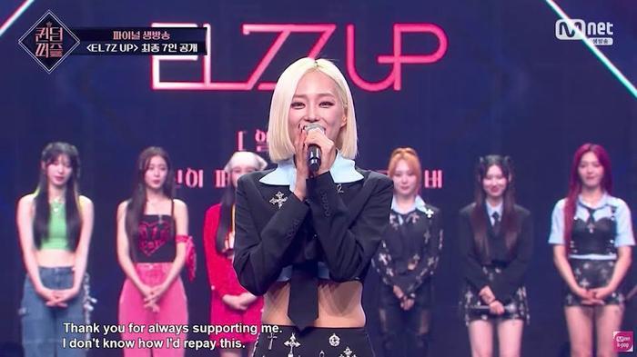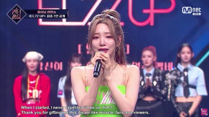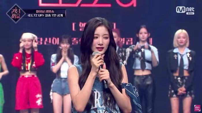 EL7Z UP第四位成员是Rocket Punch 的莲熙,当她的名字被叫到时,莲熙流下了眼泪,她说,刚开始的时候我不知道自己是否能进入TOP7,我非常感谢观众和粉丝们给了我一个梦幻般的奇迹,非常感谢粉丝和我们的成员们一直让我保持这样的状态,今后,我有信心以EL7Z UP莲熙的身份,向大家展示你们想要的所有舞台,请大家期待。