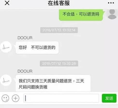 但豆得儿店只支持三天内质量问题退货和三天内尺寸问题换货,这意味着买家退货被拒绝。