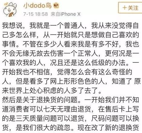 因为三百块钱逃避责任,抹黑了真粉丝,搞乱了节奏,所以最后给出的解释是错误的。即使作为店主和网购消费者,豆得儿也表示,他不知道消费者可以花7天。没有理由回来。这件事发生后,很多人都表达了对豆得儿的不满。