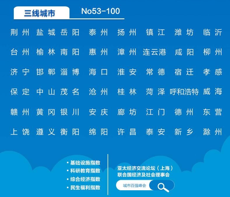 三线城市有48个,湖北荆州排第一,荆州2020年GDP为2300亿左右,在湖北排第四,连中国城市百强都没有进入,竟然能在三线城市排第一。很多城市都超过了它,像岳阳、潍坊、台州等等。只能说这份榜单也不够严谨,到后面完全是为了凑数。