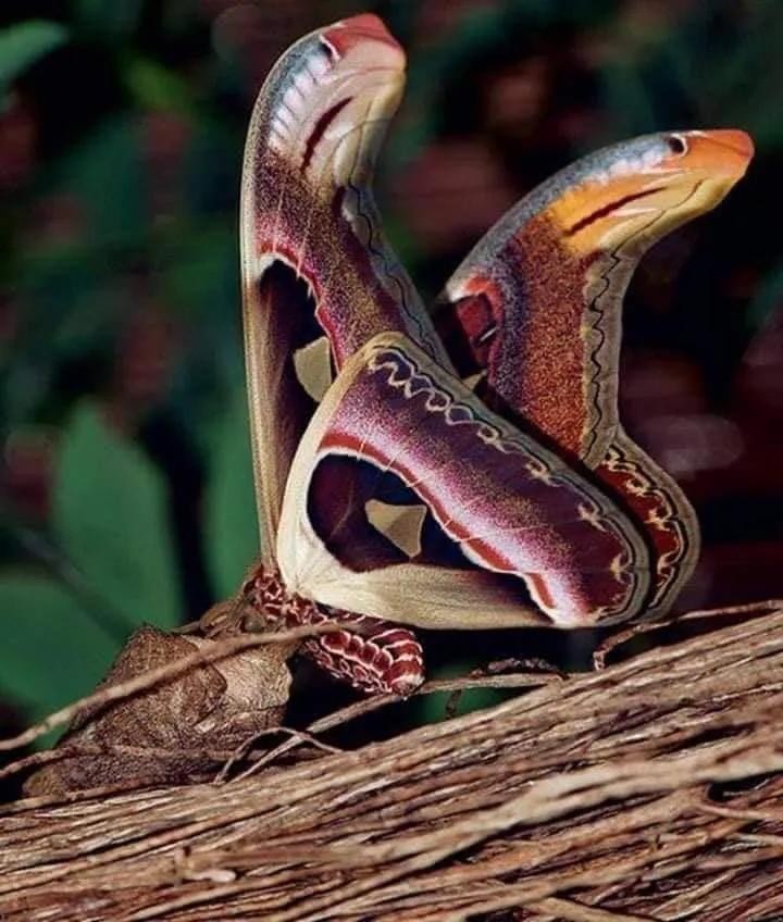 它们在翅膀的两侧有着酷似蛇头的纹路,当它们翅膀折叠停在树上时,酷似眼镜蛇昂起的蛇头,足以让捕食者退避三舍。