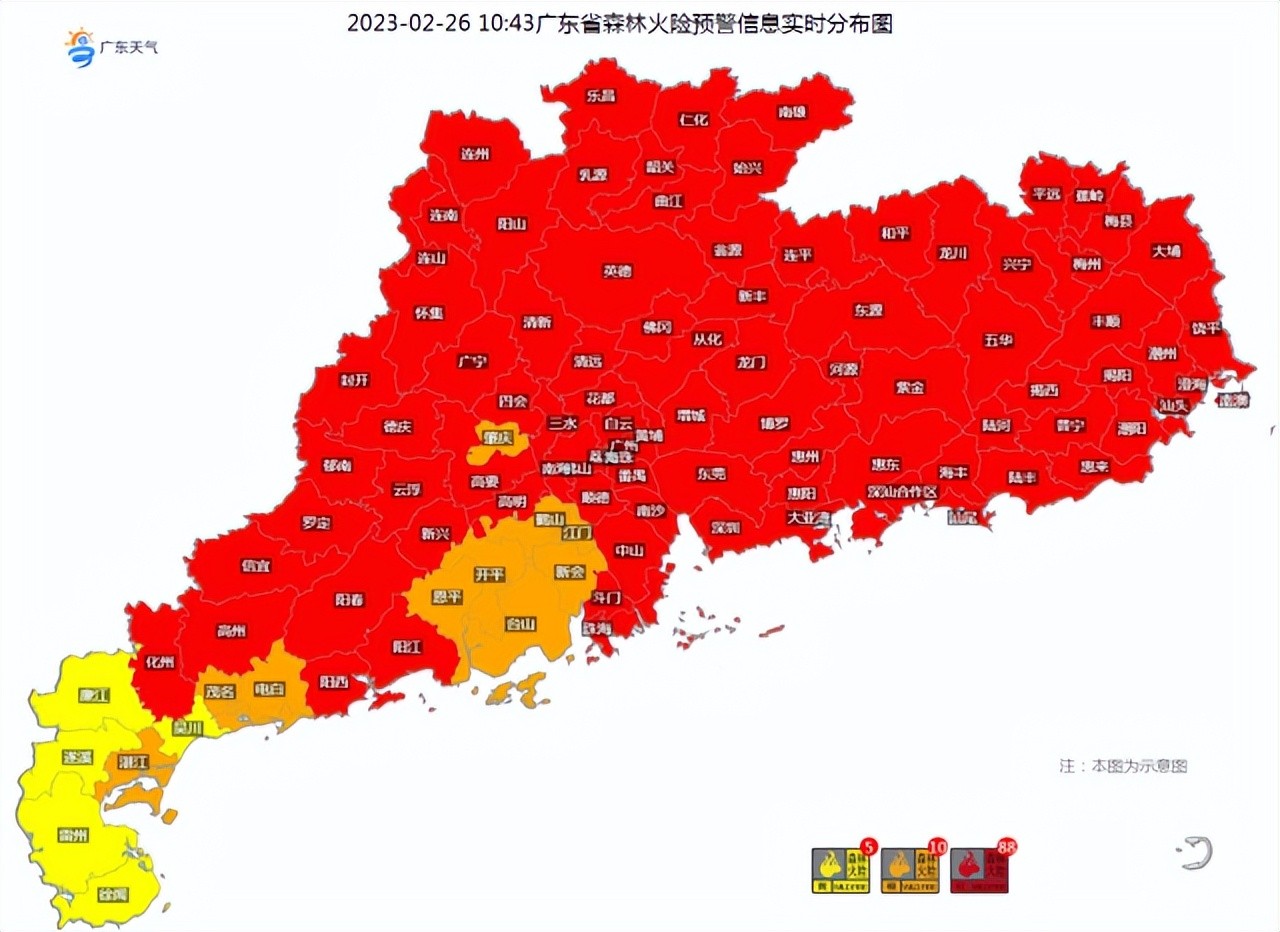 截至今日上午10时,全省森林火险预警信号继续生效,除雷州半岛为森林火险黄色预警信号以及江门、茂名、肇庆等11个市县为森林火险橙色预警信号外,其余市县均为森林火险红色预警信号。天气干燥,注意森林防火和居家用火用电安全。