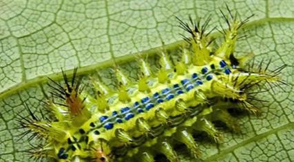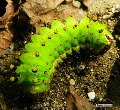 活辣子,成虫一般在1--4厘米左右,黄绿相间,看起来很像孩子们眼中的“糖宝”,认识的人都避之不及,身体有拇指粗,头部跟尾部大小差不多,各有四个角,角上布满白色细长的毛刺,这也是活辣子的防御武器,碰到它就会把毛刺竖立起来,刺伤到皮肤,会火辣辣的钻心的疼。