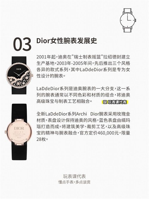 2001年起,迪奥在"瑞士制表摇篮"拉绍德封建立生产基地。2003年-2005年间,先后推出三个风格各异的款式系列,其中LaDdeDior系列是专为女性设计的腕表。