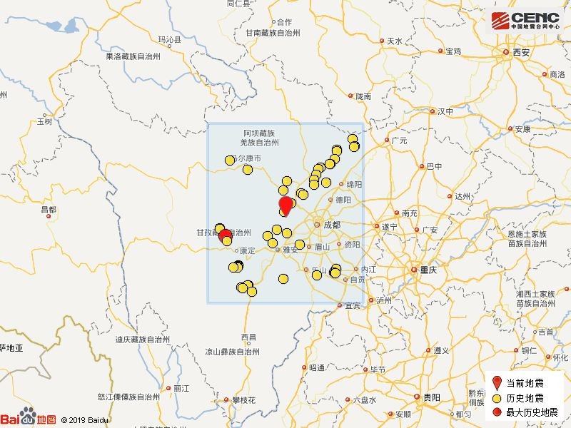 历史地震:根据中国地震台网速报目录,震中周边200公里内近5年来发生3级以上地震共136次,最大地震是2014年11月22日在四川省甘孜藏族自治州康定县发生的6.3级地震(距离本次震中162公里),按震级大小前50次历史地震分布如图。