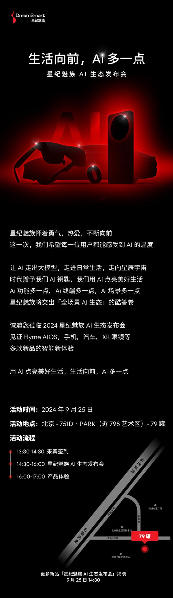 快科技 9 月 12 日消息,星纪魅族正式宣布将于 9 月 25 日举办 " 生活向前,AI 多一点 " 星纪魅族 AI 生态发布会,届时包括 Lucky 08 手机、领克 Z10 电竞定制版车、AR 智能眼镜 StarV View 以及智能穿戴设备将正式登场。