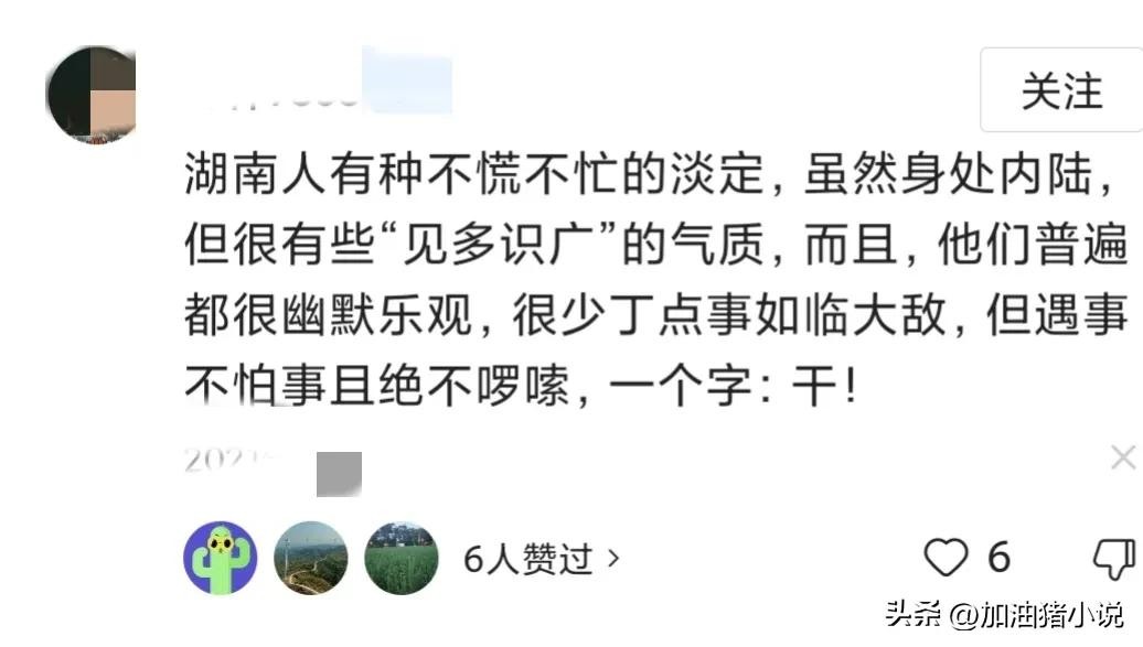 湖南人有种不慌不忙的淡定,虽然身处内陆,但有很多“见多识广”的气质,而且他们普遍都很幽默乐观,很小丁的事,如临大敌,但遇事不怕事,且绝不啰嗦一个字:干