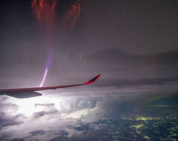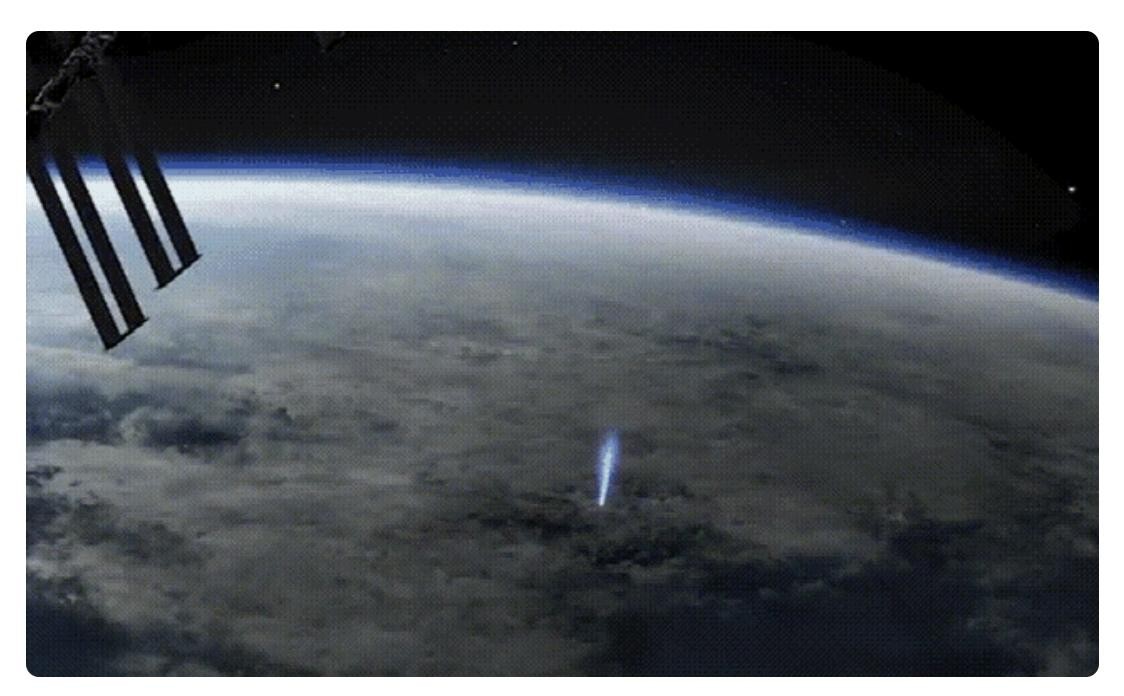 照片中出现的巨大喷流,其实是一种反向闪电(或者叫作逆向闪电),其从云层中射出,并消失在太空边缘,喷流的高度估计有数十公里。