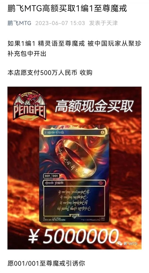 然而这个悬赏才公布没多久,今天国内知名的卡牌店家鹏飞MTG就宣布将以500万人民币的价格收购这张卡牌,瞬间将这张至尊之戒的身价再度炒高。