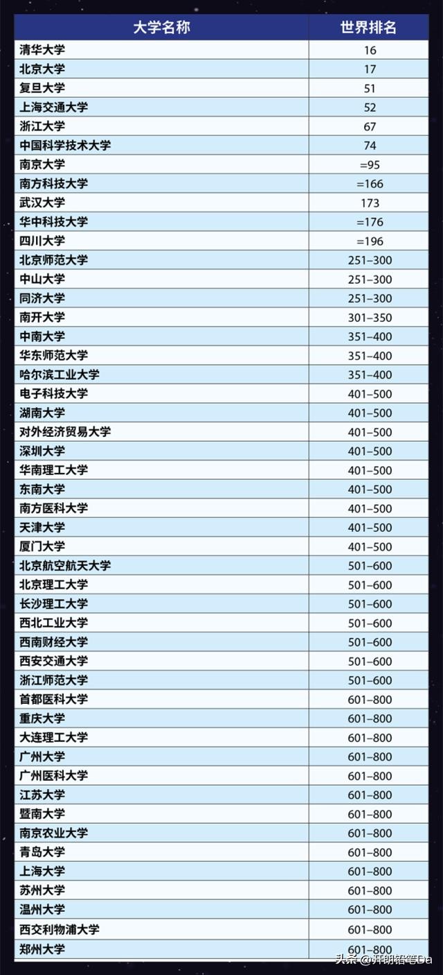 在2023QS世界大学排名中,中国大陆共有71所高校上榜,其中排名前十的高校分别是北京大学(世界排名第12名)、清华大学(世界排名第14名)、复旦大学(世界排名第34名)、浙江大学(世界排名第42名)、上海交通大学(世界排名第46名)、中国科学技术大学(世界排名第94名)、南京大学(世界排名第133名)、武汉大学(世界排名第194名)、同济大学(世界排名第9名)、哈尔滨工业大学(世界排名第10名)。