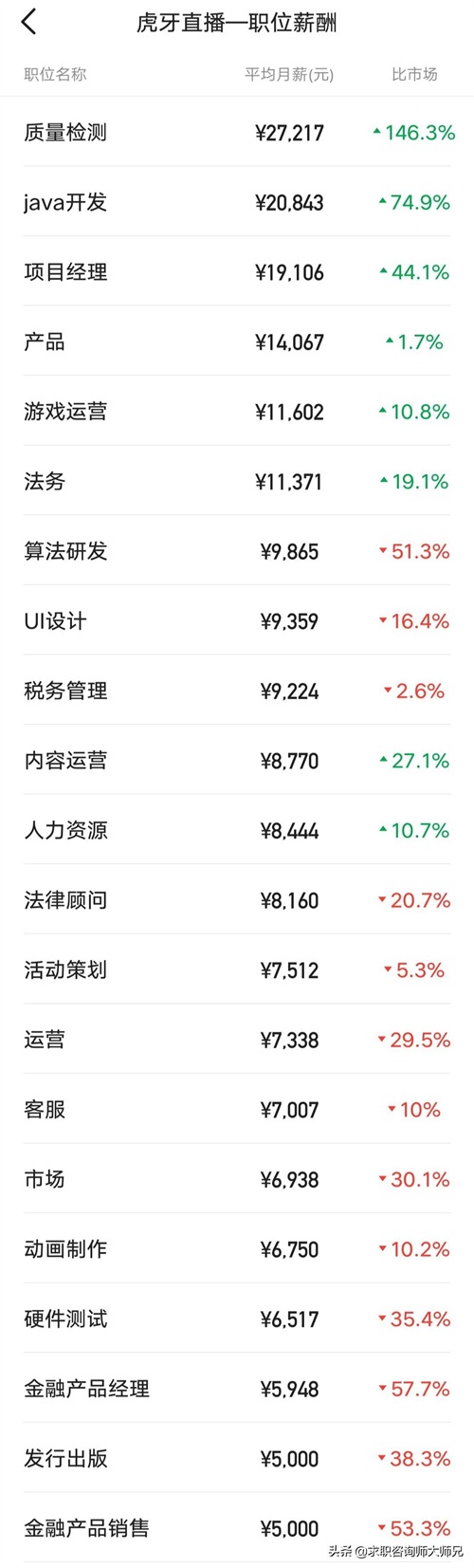 重点来了,公司的薪资待遇情况。虎牙直播公司的的平均月薪为10,316元。(数据源于大师兄APP)