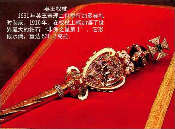 第二名,英国王室珠宝:镶嵌在权杖上的“非洲之星”(中间水滴状)和“帝国王冠”上的“库里南2号”(王冠下方正中间)