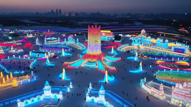 冰雪大世界以其壮观的冰雕和雪景成为冬季旅游的热门景点。