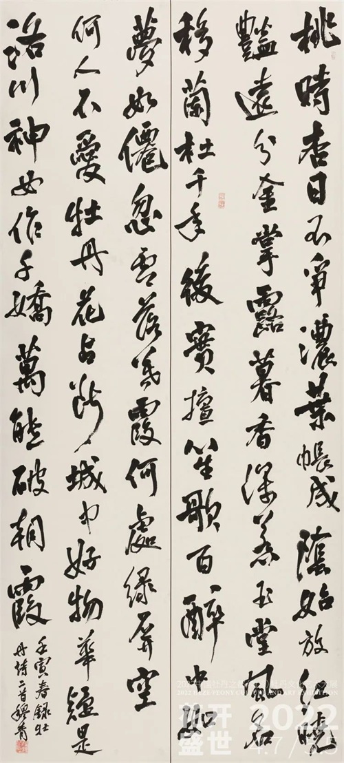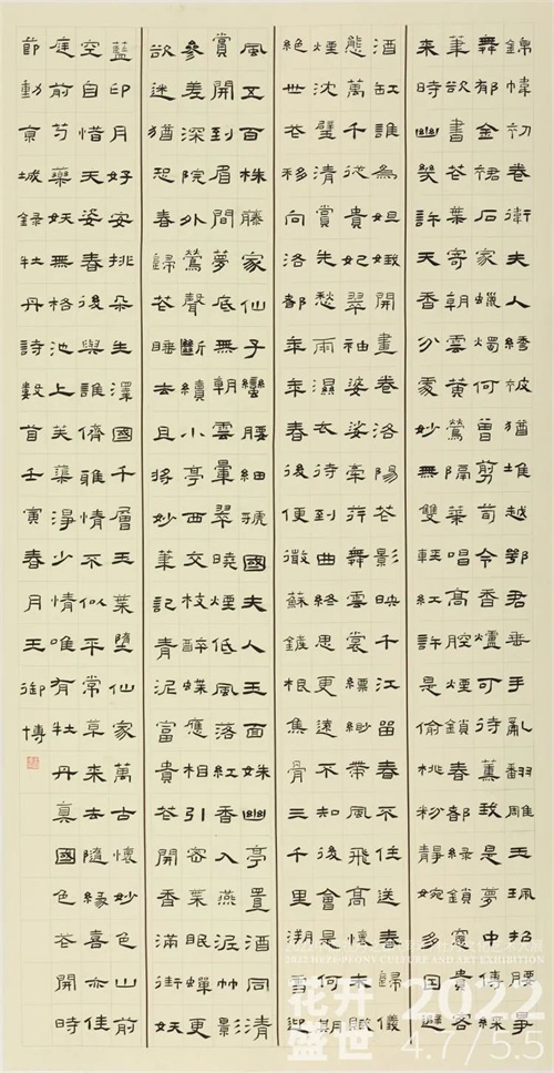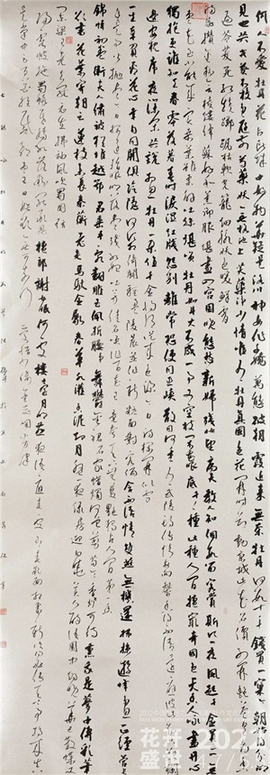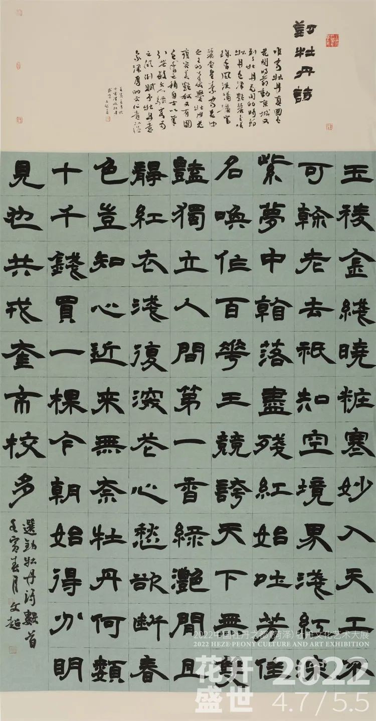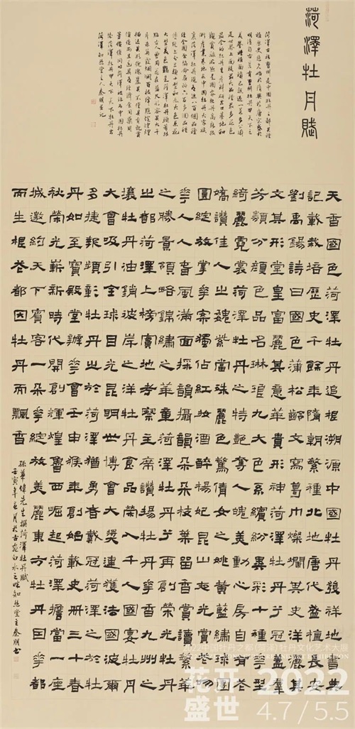 八尺整张创作的《菏泽牡丹赋》以篆隶之古朴厚重,行书之灵动飘逸,体现出菏泽牡丹多姿多彩、雍容华贵、国色天香之高贵品质。