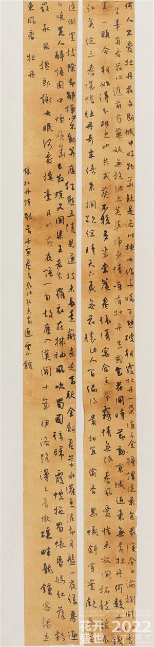 作品内容为牡丹相关诗词文赋,墨选用红星墨液, 纸张选用做旧蝉翼毛边,创作风格取米二王一路,突出自然书写性墨色变化。