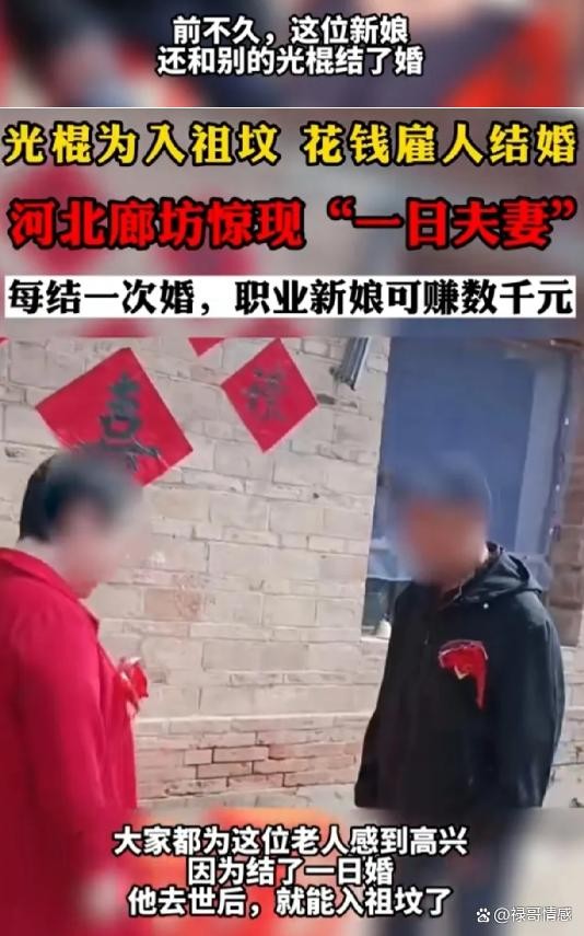 据顶端新闻记者郑旭报道,近日,有网传消息称,在河北廊坊,只有结了婚的人才可以进祖坟,所以有的未婚老汉会雇人举办一场“一日夫妻”仪式,只摆酒席不入洞房。