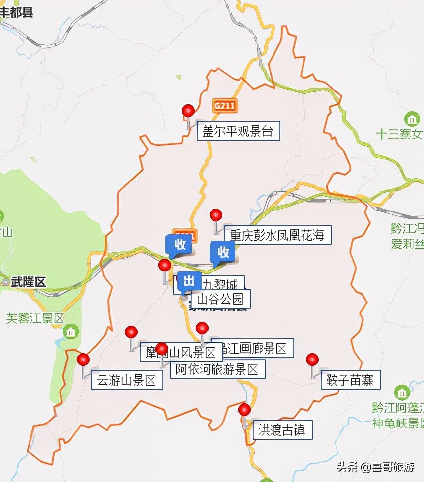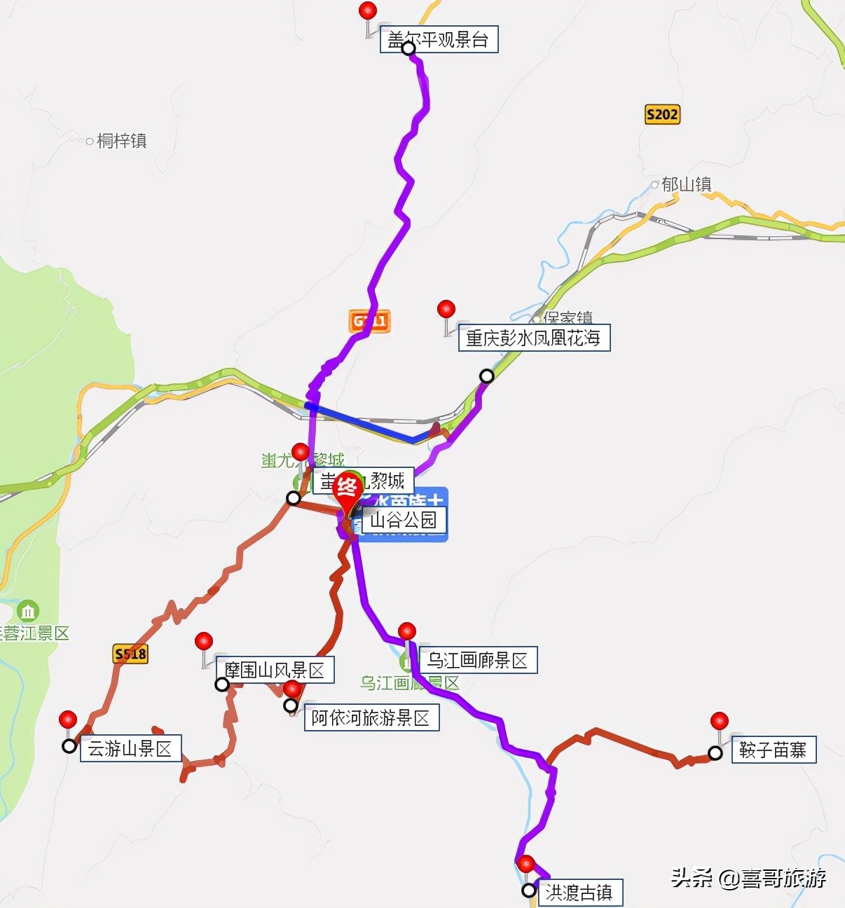 2、重庆彭水县十大景点自驾游行程路线:重庆彭水县-山谷公园-蚩尤九黎城-重庆彭水凤凰花海-盖尔坪观景平台-云游山景区-摩围山风景区-阿依河旅游景区-乌江画廊景区-洪渡古镇-鞍子苗寨-重庆彭水县。