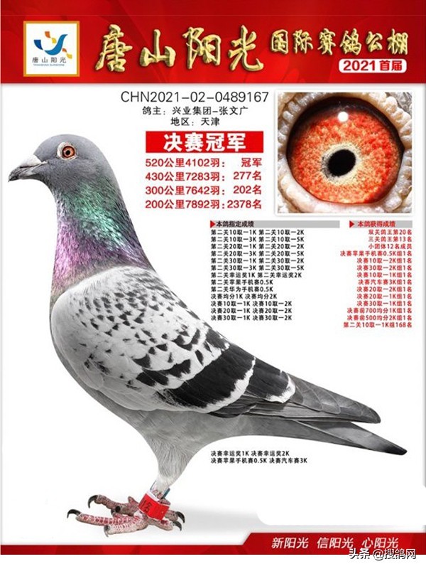 唐山阳光国际赛鸽公棚的首届比赛,参赛费8000元。决赛中,天津鸽友大放异彩,荣获前十名的鸽友当中,天津鸽友占据了六个席位,唐山主场变成了天津鸽友的饕餮盛宴。当天13:18:40.650,兴业集团-张文广环号2021-02-0489167的雨点飞鸽,雄姿英发,首先入棚,分速为:1409.634米/分,获得了唐山阳光国际公棚首届比赛的冠军,赢得300万奖金。