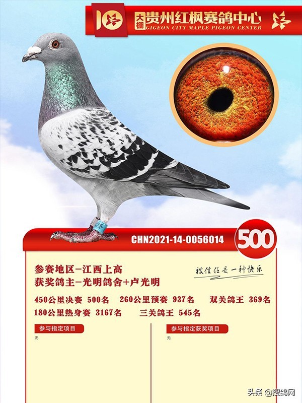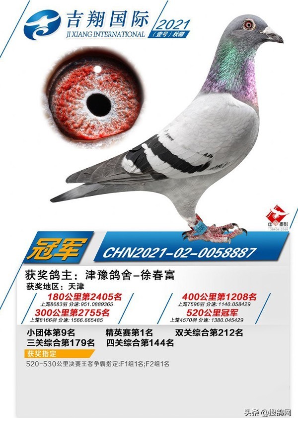 天津吉翔国际(壹号)公棚2021年也是首届办赛,参赛费5888元,冠军奖金120万元。伴随着鸽友们的期待,决赛当天13时35分57秒,净豫鸽舍-徐春富的一羽02-0058887灰色战将拔得头筹,分速1380米/分。吉翔公棚在2022年1月1日也将赴山西五台山,邀请大德高僧数十名,为鸽友祈福。首届赛事奖杯将开光后发还鸽友。