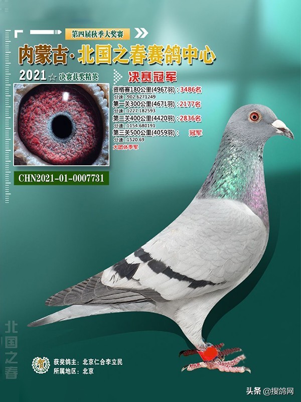 2021年是北国之春赛鸽中心的第四届比赛,参赛费5000元,700个决赛奖位,10台免费奥迪车。百万大奖是有来自北京的北京仁合李立民鸽友拿下,回顾此羽赛鸽的夺冠路程,算得上是见证了一部逆袭好戏。资格赛中仅获3486名分速仅902米/分,一关300公里加速获得2177名,二关400公里顿一顿,拿下2836名。决赛中大爆发一举拿下冠军,并飞出1520米/分的高分速!