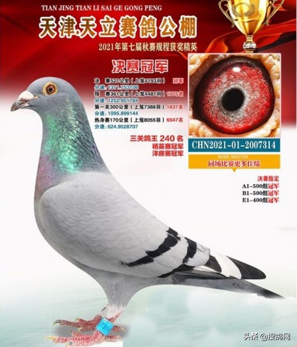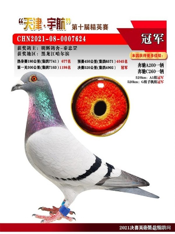 天津宇航公棚参赛费5999元。大小棚联合对抗,奔驰免费汽车4辆。决赛更有百辆豪车,参赛鸽全部佩戴GPS脚环。黑龙江哈尔滨的鸽友明辉鸽舍-秦忠罡麾下的08-0007624灰,在预赛仅获得4045名的前提下,决赛中勇猛无比,直接拿下冠军,荣获百万奖金。