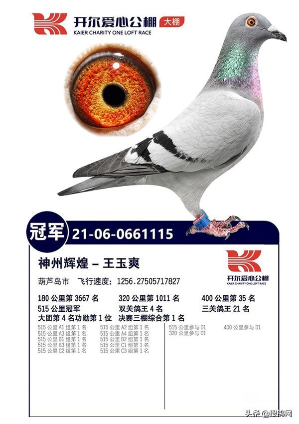开尔爱心公棚,参赛费16800元。而神州辉煌—王玉爽是鸽界知名强豪,来自辽宁葫芦岛市。在开尔爱心公棚第三关绝杀关比赛中,他的赛鸽表现最为突出,勇夺515公里冠军,捧获千万大奖。这是王玉爽第三年在开尔爱心公棚夺得前名次奖,成功上演帽子戏法。这羽冠军鸽获得双关鸽王4名,三关鸽王21名。收费站和首关表现并不突出,排名千名之外,但是预赛之后突飞猛进,获得预赛35名,决赛冠军,可谓是相当耀眼的表现。