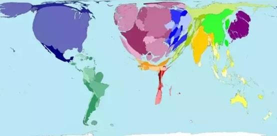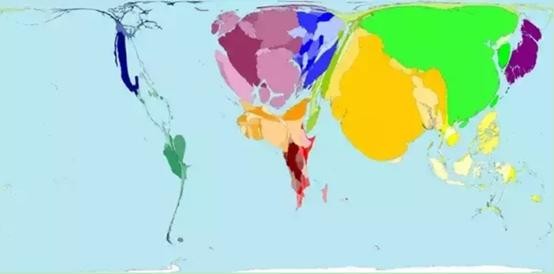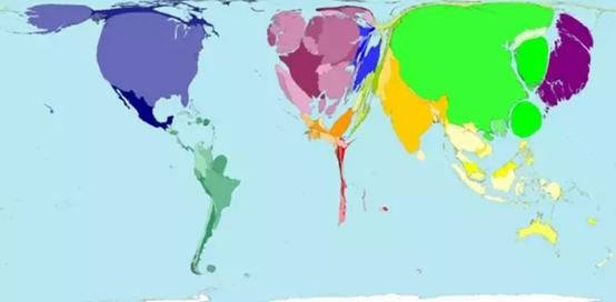 2015年世界财富分布图。中国又重新夺回头把交椅,印度紧随其后。 美国和欧洲大部分地区都在萎缩。 在欧洲,俄罗斯急剧萎缩,而德国,意大利和法国则没有那么大的萎缩。 东南亚也有了实质性增长,泰国,新加坡和印度尼西亚现在已经很大,而非洲和南美却没有变化。