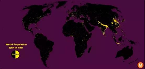世界人口的一半分布在黄色区域,其余一半在所有黑色区域。