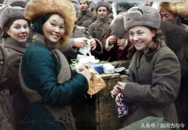 1942年第二次世界大战中的女苏联士兵 ,当时蒙古代表团派出慰问团前往赠送礼物。