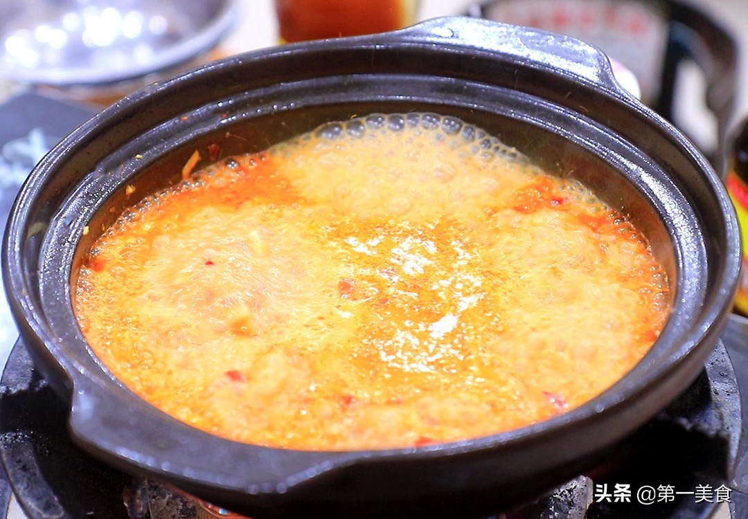 2.把砂锅烧热,倒入植物油,放入肉末煸炒一会儿,肉末炒香、炒变色后撒入几粒青花椒,倒入蒜姜末一起翻炒出蒜香味,再倒入小米椒、野山椒,加入一勺豆瓣酱翻炒出红油,然后倒入高汤,没有高汤的话加清水也可以,加入适量的食盐、蚝油、老抽,大火烧开后转小火熬制10分钟。