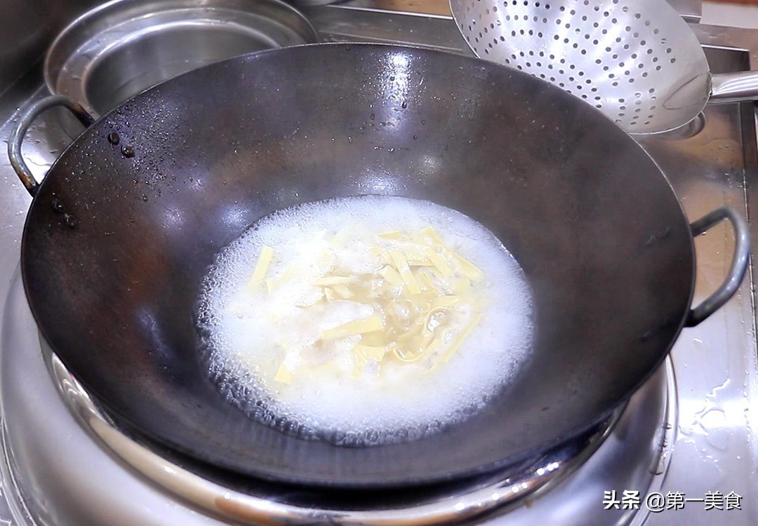 再来一把宽粉,一张豆腐皮切成条,蒜苗段、姜片备用。