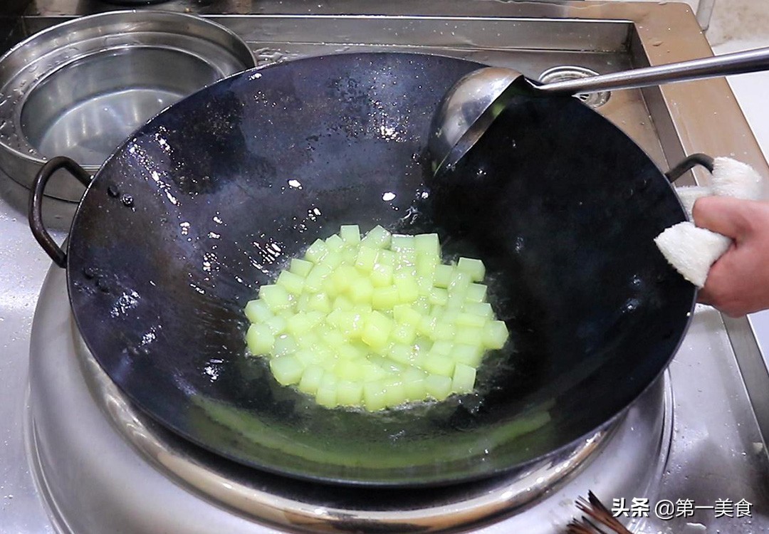3.锅内烧油,充分滑锅以后倒出热油留少许底油,这一步主要是为了防止凉粉粘锅,把凉粉倒入锅中,经常晃动锅让凉粉均匀受热,大约翻炒2分钟,凉粉表面微微透亮时倒出来控油。