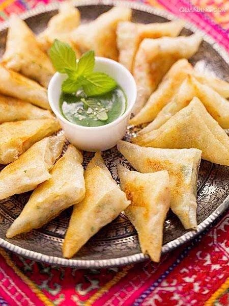 说起印度菜中开胃菜的特色,比起主菜绝对是有过之而无不及。用机器压制成的黄豆泥,由于泥中添加胡椒粒和盐巴,吃时不妨以油炸方式使薄片上部分盐分流失,口感较不咸且符合健康原则。嗜辣者不妨撒点辛香粉和稠咖喱,别有风味。香酥的咖喱脆饺素有“孟买蝴蝶”之称,外皮似越式春卷皮,内包二种口味,马铃薯或肉酱,且吃得出青豆仁、青辣椒丁和洋葱香,若沾上特制的绿酱一起食之,口感则岂只是单纯惊奇而已。因为这绿酱可是用香菜末、洋葱、盐、柠檬汁、青辣椒作成的泥状蘸料。另外,印度人最爱吃的除了洋葱、咖喱、膳饼之外,还有各式奶酪制品。最特别的吃法分为甜与咸两饼,润颜又助消化。如黄瓜奶露,在新鲜柠檬糊状奶酪里放入小黄瓜、洋葱及番茄,酸咸开胃。另一种液态饮品酸乳,里面可随个人喜好添加糖、盐或者甜巧克力粉。由于宗教信仰的缘故,印度菜多羊肉、鱼、鸡肉与鲜蔬菜养生素(指可吃蒜、洋葱)。各食材依不同香料烹调出“指”颊留香的美醇原汁烩菜。最典型的就是干烧咖喱虾。先以鲜虾浸入烫咖喱汁中除腥,再加入香料爆香块炒,沥汁后起锅,肉质弹性特佳。另外就是有名的咖喱鸡,不油、不辣、淡咸适中入味,需有信手拈来的火候功夫才行。