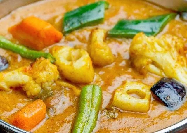 特色:很多印度人都是素食主义者,所以蔬菜类的菜品在餐桌上必不可少。“什锦咖喱鲜蔬”就是将菜花、土豆、豆角、胡萝卜等蔬菜切成各种大小不等的块,放在一起清炒,最后放入咖喱进行调味。这也是一道很典型的印度菜。
