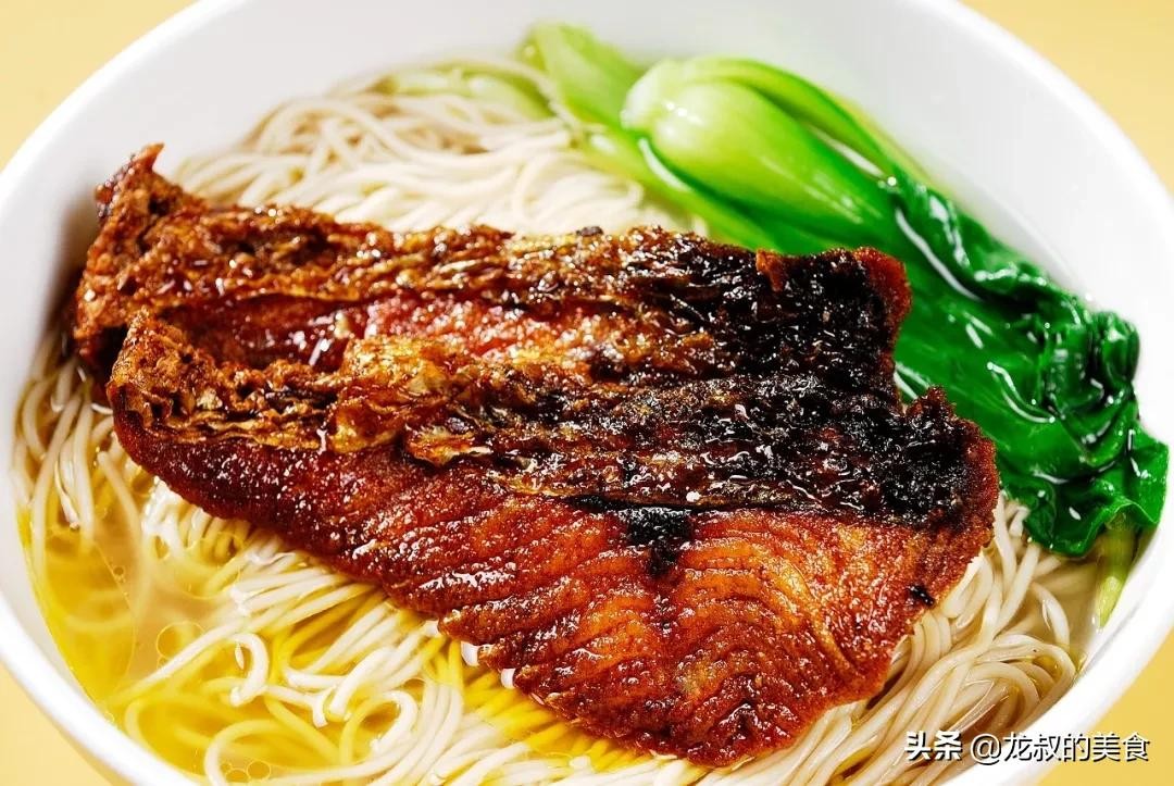 其次就是充作面浇的爆鱼,采用的是鲜灵活跳的出自于双洋潭或是阳澄湖的肥嫩青鱼,既不能大又不能小,五斤左右为准,若遇酷热鱼缺,宁可停供,也不用杂鱼充数。宰杀时鲜鱼不落地,保持清洁,下刀厚薄均匀。制作时,先将切好的鱼片放入酱油、白糖、曲酒以及葱姜香料配成的卤汁中浸入味,然后再以旺火大锅氽至棕黄色,嫩度适宜,两次烩锅,冰糖烩煮,陈酿取香,色泽棕红,浓厚鲜香。