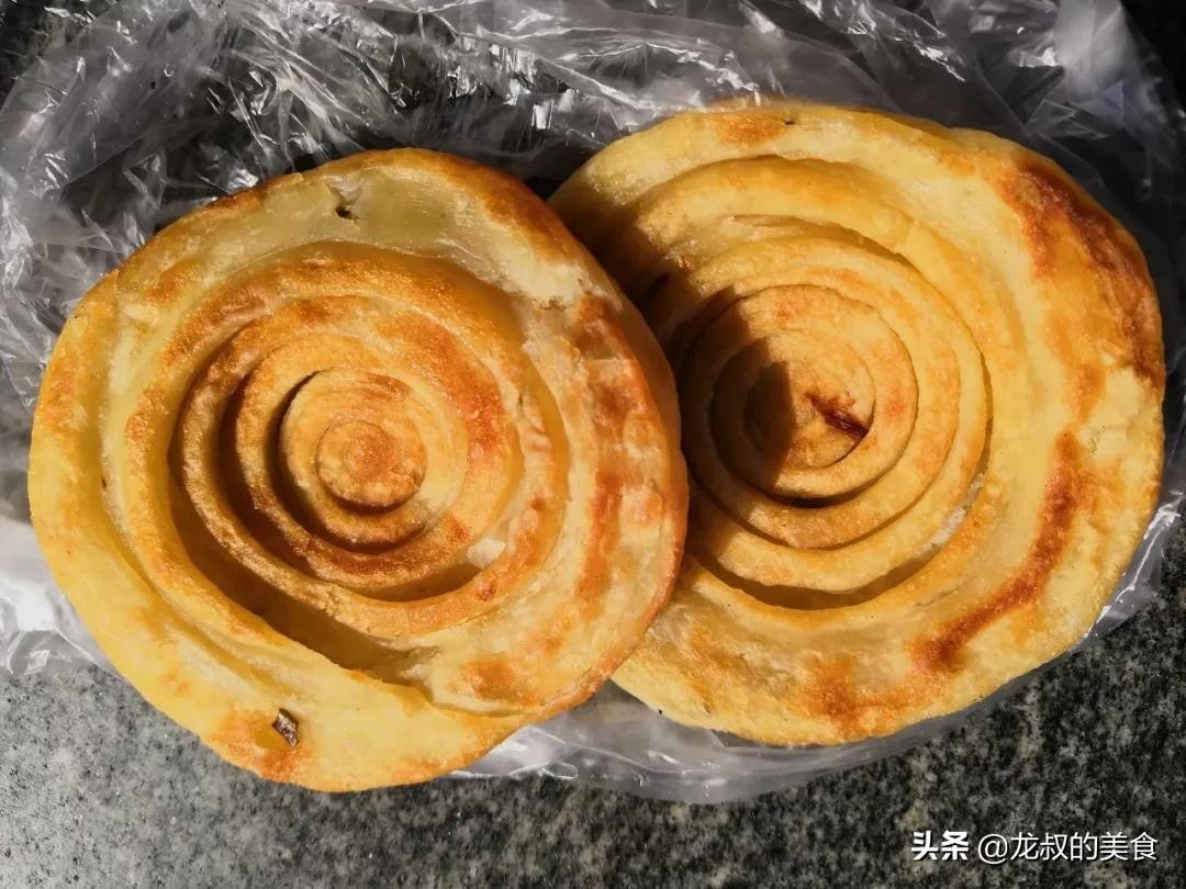 油旋,又叫“油旋回”,清代顾仲编著的《养小录》中这样记载油旋的制作:“和面作剂,擀开。再入油成剂,擀开。再入油成剂,再擀如此七次。灶烙之,甚美。”油旋外皮酥脆,内瓤柔嫩,葱香透鼻,因其形似螺旋,表面油润呈金黄色,故名油旋。济南人吃油旋多是趁热吃,再配一碗鸡丝馄饨,可谓物美价廉,妙不可言。
